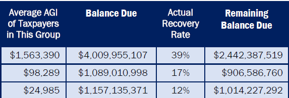 The following chart shows that delinquent taxpayers having an average AGI of over $1.5 million paid the IRS an average of 39 percent of what they owed. These high-income taxpayers still owed over $2 billion.