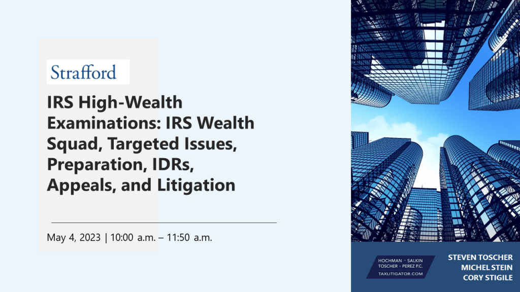 We are pleased to announce that Steven Toscher, Michel Stein and Cory Stigile will be speaking at the upcoming Strafford webinar “IRS High-Wealth Examinations: IRS Wealth Squad, Targeted Issues, Preparation, IDRs, Appeals, and Litigation,” Thursday, May 4, 2023, 10:00 a.m. – 11:50 a.m. (PST).