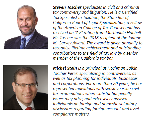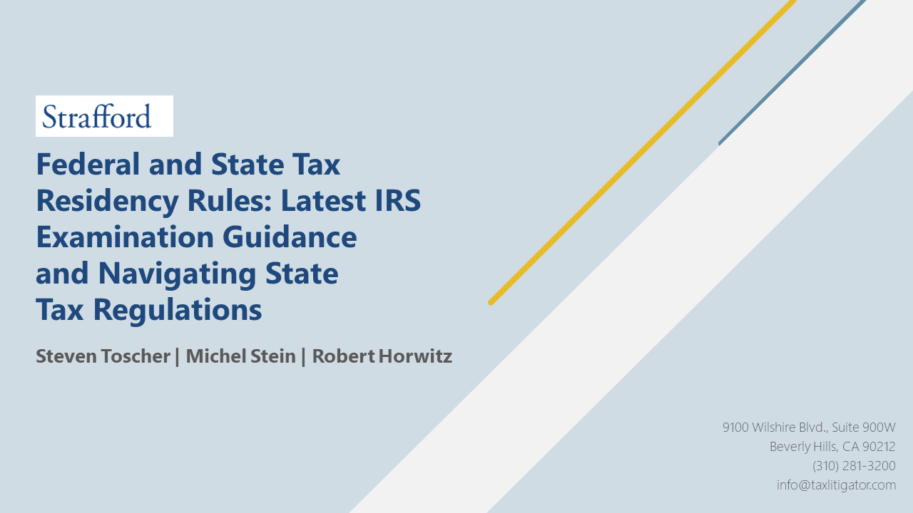 We are pleased to announce that Steven Toscher, Michel Stein, and Robert Horwitz will be speaking at the upcoming Strafford webinar “Federal and State Tax Residency Rules: Latest IRS Examination Guidance and Navigating State Tax Regulations” Thursday, September 21, 2023, 10:00 a.m. – 11:50 a.m. (PST).