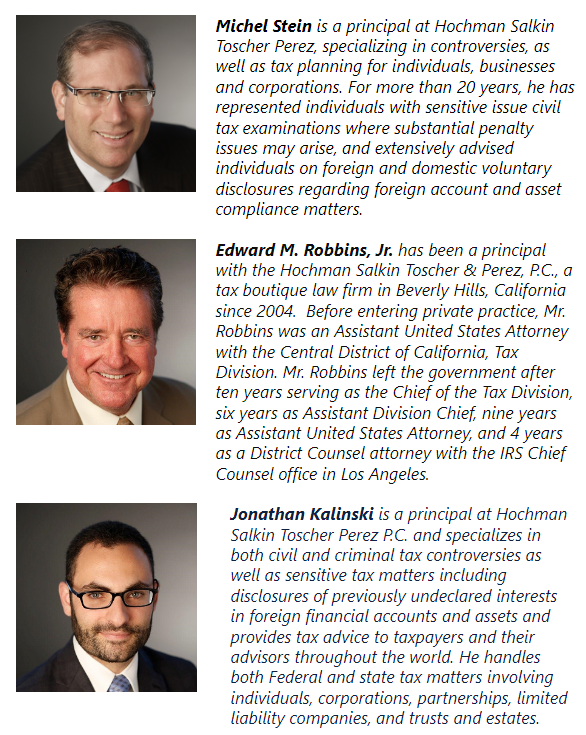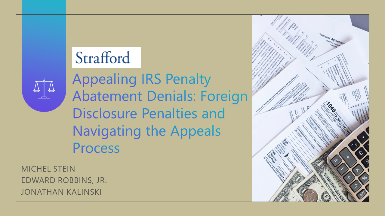 We are pleased to announce that Michel Stein, Edward Robbins, Jr. and Jonathan Kalinski will be speaking at the upcoming Strafford webinar, “Appealing IRS Penalty Abatement Denials: Foreign Disclosure Penalties and Navigating the Appeals Process” on Wednesday, October 4, 2023 from 10:00 a.m. – 11:30 a.m. (PST).