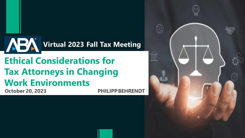 We are pleased to announce that Philipp Behrendt will be speaking on Ethical Considerations for Tax Attorneys in Changing Work Environments at the upcoming ABA Virtual 2023 Fall Tax Meeting on October 20, 2023 at 1:15 p.m. (PST).