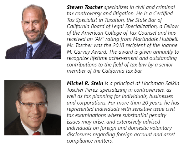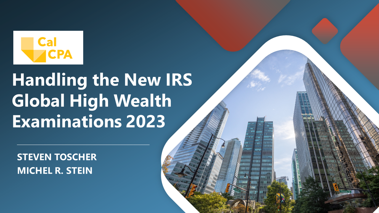 We are pleased to announce that Steven Toscher and Michel R. Stein, will be speaking at the upcoming CalCPA webinar “Handling the New IRS Global High Wealth Examinations 2023,” Tuesday, November 14, 2023, 9:00 a.m. – 10:00 a.m. (PST).
