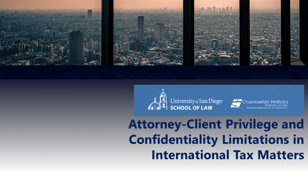 We are pleased to announce that Evan Davis will be speaking at the upcoming USD School of Law – Chamberlain International Tax Institute Conference on the on the topic of “Attorney-Client Privilege and Confidentiality Limitations in International Tax Matters” on Monday, February 19, 2024, 3:00 p.m. – 4:00 p.m. (CST), along with co-panelists Ana Elena Domínguez, Galicia Abogados (Mexico City), Jeremy Temkin, Morvillo, Abramowitz, Grand Iason & Anello PC (New York City), and Jaime Vásquez, Chamberlain Hrdlicka (San Antonio)