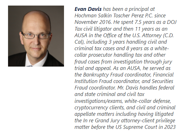 We are pleased to announce that Evan Davis will be speaking at the upcoming USD School of Law – Chamberlain International Tax Institute Conference on the on the topic of “Attorney-Client Privilege and Confidentiality Limitations in International Tax Matters” on Monday, February 19, 2024, 3:00 p.m. – 4:00 p.m. (CST), along with co-panelists Ana Elena Domínguez, Galicia Abogados (Mexico City), Jeremy Temkin, Morvillo, Abramowitz, Grand Iason & Anello PC (New York City), and Jaime Vásquez, Chamberlain Hrdlicka (San Antonio)