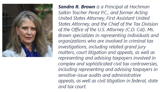 We are also pleased to announce that Sandra R. Brown will be moderating a panel at the upcoming ABA 39th National Institute on White Collar Crime on the topic of “The Powers and Perils of Parallel Criminal and Civil Investigations” on Wednesday, March 6, 2024, 10:30 a.m. (PST), with panelists Ronald Cheng (Pillsbury Winthorp), Caroline Ciraolo (Kostelanetz), Mary Hammond (IRS Global Operations Policy & Support) and Pamela L. Johnston (Foley & Lardner).