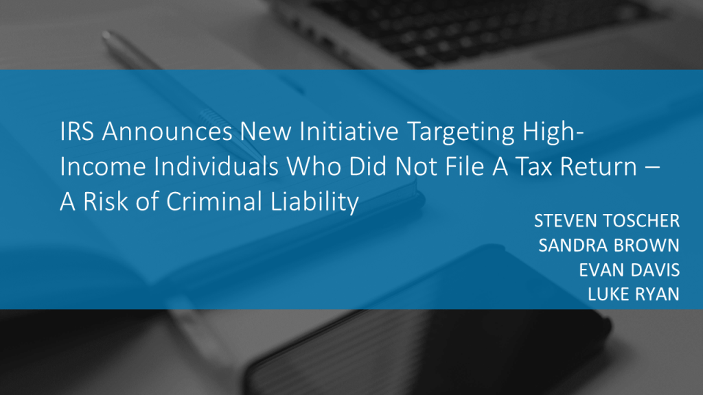 IRS Announces New Initiative Targeting High-Income Individuals Who Did Not File A Tax Return – A Risk of Criminal Liability by Steve Toscher, Sandra Brown, Evan Davis and Luke Ryan