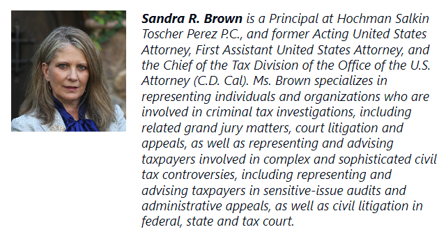 We are pleased to announce that Sandra R. Brown will be moderating a panel at the upcoming ABA Tax Section 2024 May Tax Meeting on the on the topic of “The Importance of Interview Notes in Criminal Matters, From Investigation Through Sentencing” on Saturday, May 4, 2024, 10:30 a.m. (EST), along with co-panelists, Michael Kelly (Akerman LLP), Sara Kropf (Kropf Moseley PLLC) and Daniel Cady Davidson (Kostelanetz LLP).