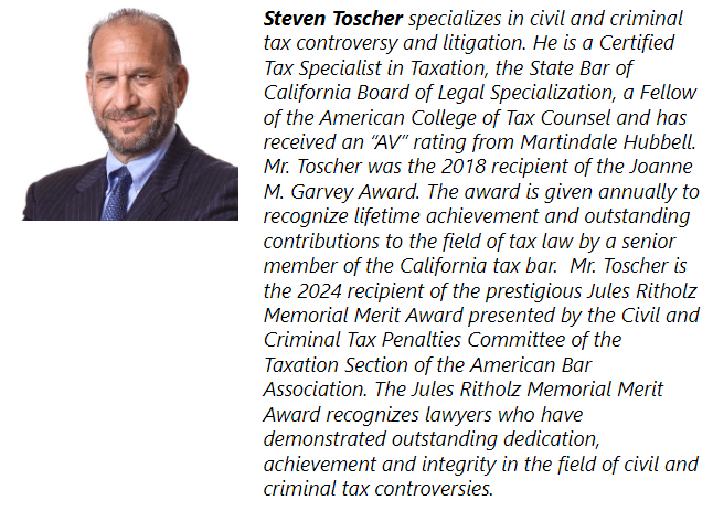 We are pleased to announce that Steven Toscher, Michel R. Stein and Evan Davis will be speaking at the upcoming Strafford webinar “Cryptocurrency Tax Compliance: Tax Filing Requirements, Managing IRS Examinations” Thursday, May 9, 2024, 10:00 a.m. – 11:30 a.m. (PST).