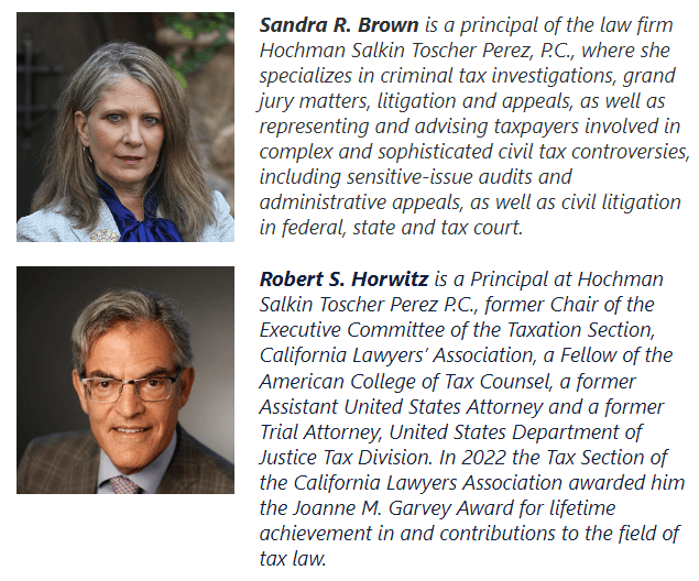 We are pleased to announce that Steven Toscher, Sandra R. Brown and Robert Horwitz will be speaking at the upcoming CalCPA webinar “IRS Scrutiny of ERCs” Tuesday, June 11, 2024, 9:00 a.m. – 10:30 a.m. (PST).
