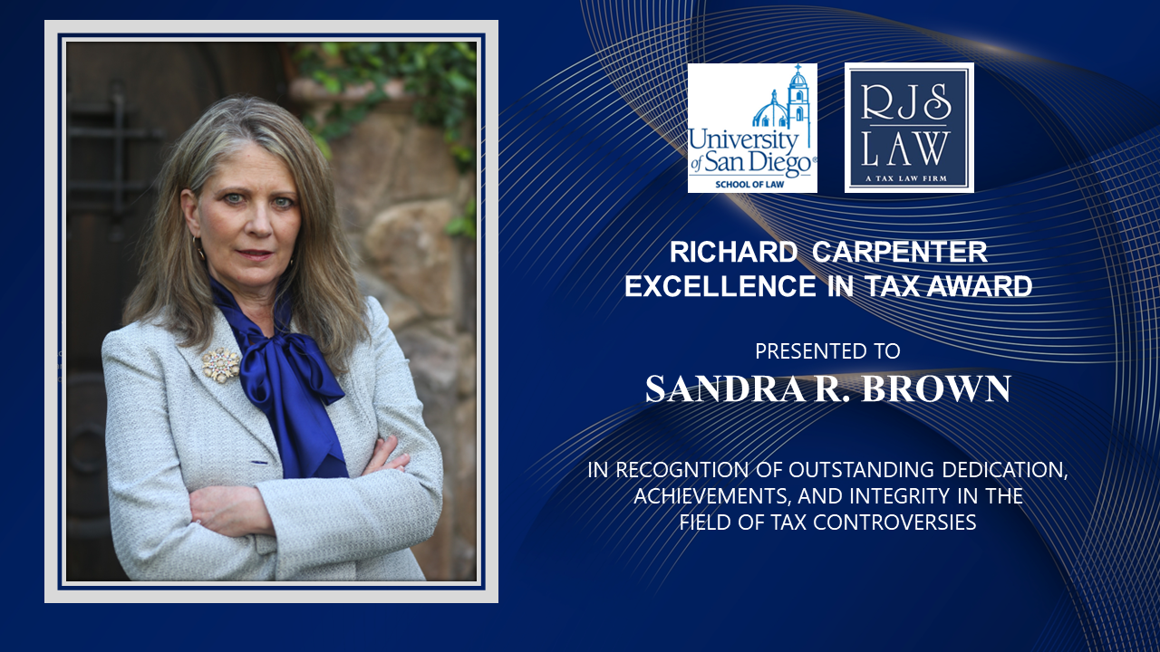 We are pleased to announce that Sandra R. Brown will be receiving the prestigious Richard Carpenter Excellence in Tax Award from the USD School of Law – RJS LAW Tax Controversy Institute. The Award is being presented at the 9th Annual USD School of Law – RJS LAW Tax Institute taking place July 19th in San Diego, California.
