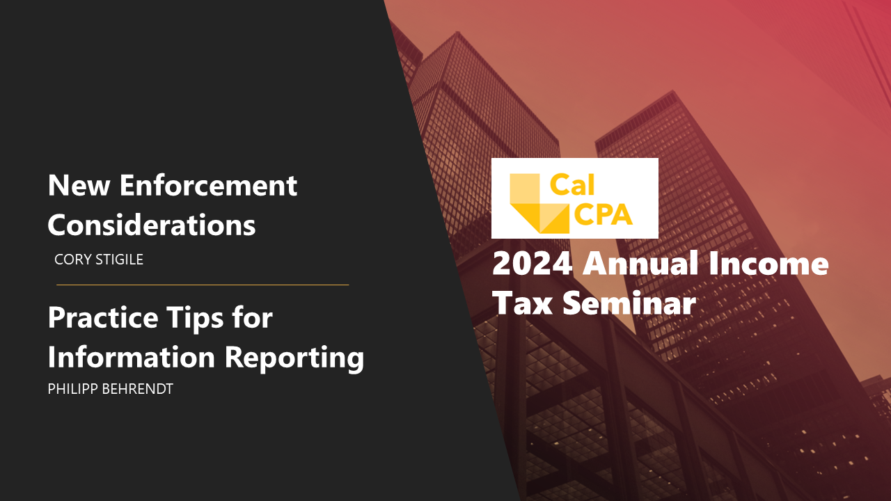 We are pleased to announce that Cory Stigile and Philipp Behrendt will be speaking at the upcoming CalCPA 2024 Annual Income Tax Seminar, Friday, July 26, 2024, 8:00 a.m. – 1:45 p.m. (PST) on the following topics:
