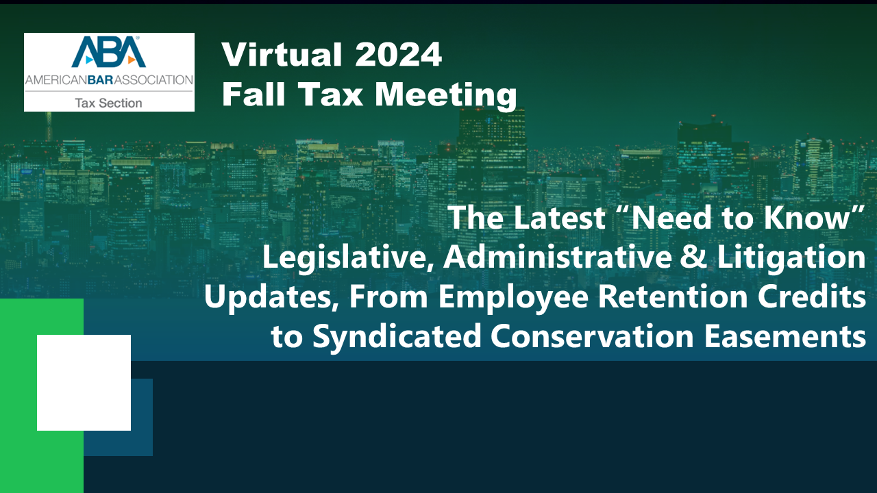 We are pleased to announce that Jonathan Kalinski along with John Nail (Bradley Arant Boult Cummings LLP) will be speaking at an upcoming ABA Tax Section Virtual 2024 Fall Tax Meeting on The Latest “Need to Know” Legislative, Administrative & Litigation Updates, From Employee Retention Credits to Syndicated Conservation Easements, Tuesday, September 24, 2024, 2:30 p.m. – 4:00 p.m. (PST).
