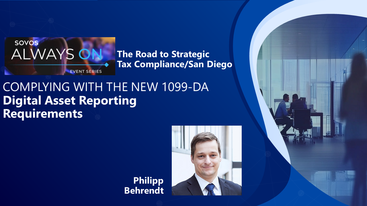 We are pleased to announce that Philipp Behrendt will be speaking at the upcoming Sovos Always on Event Series – The Road to Strategic Tax Compliance/San Diego Complying with New 1099-DA Digital Assets Reporting Requirements seminar, which will take place at the San Diego Wine & Culinary Center on Tuesday, December 10, 2024, 2:45 p.m. – 3:30 p.m. (PST)