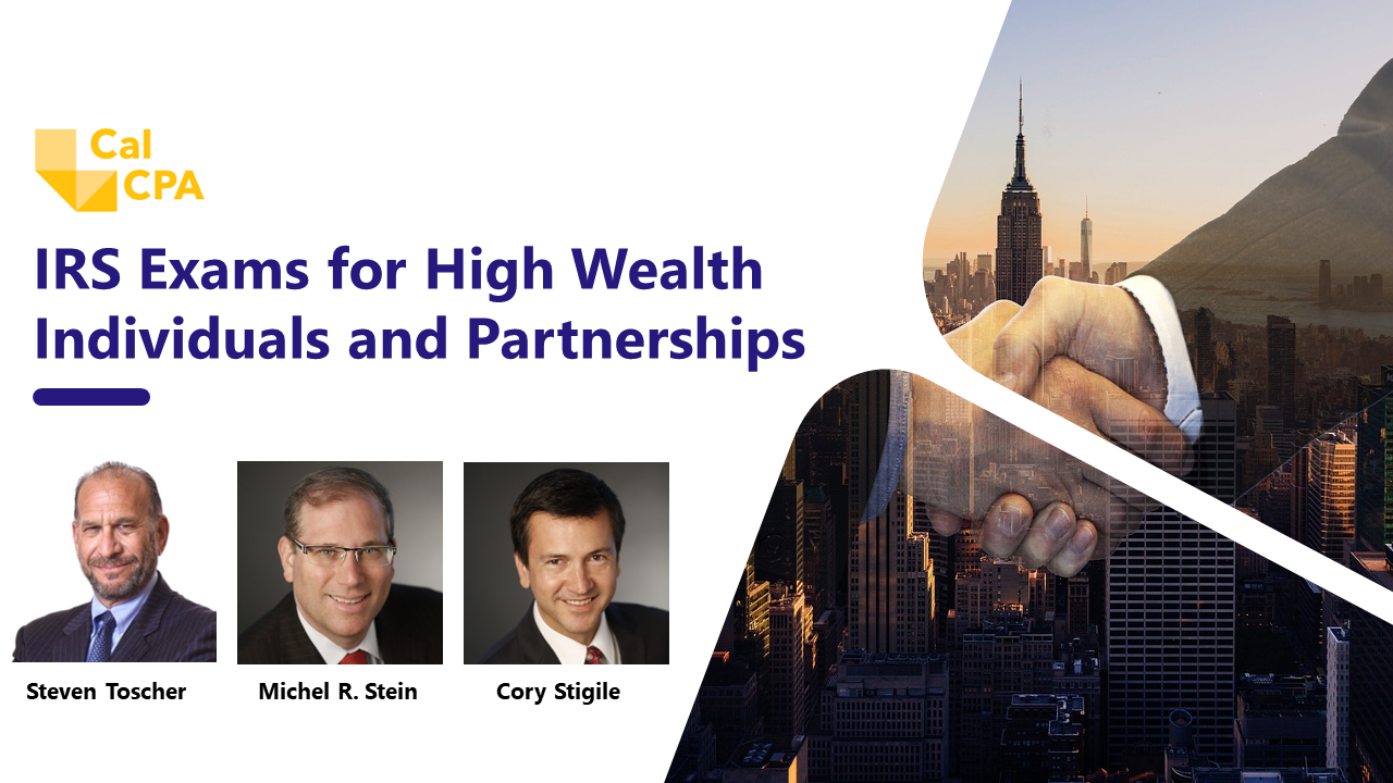 We are pleased to announce that Steven Toscher, Michel R. Stein and Cory Stigile will be speaking at the upcoming CalCPA IRS Exams for High Wealth Individuals and Partnerships webinar, Tuesday, December 10, 2024, 9:00 a.m. – 10:30 a.m. (PST).