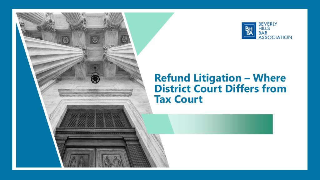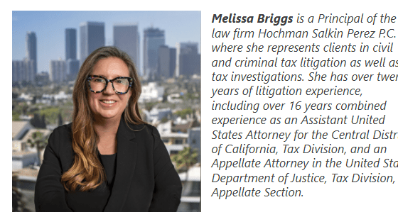 We are pleased to announce that Melissa Briggs along with Gary Slavett (Holtz, Slavett & Drabkin, APLC) will be speaking at the upcoming Beverly Hills Bar Association Refund Litigation – Where District Court Differs from Tax Court webinar, Tuesday, May 6, 2025, 12:00 p.m. – 1:30 p.m. (PST).