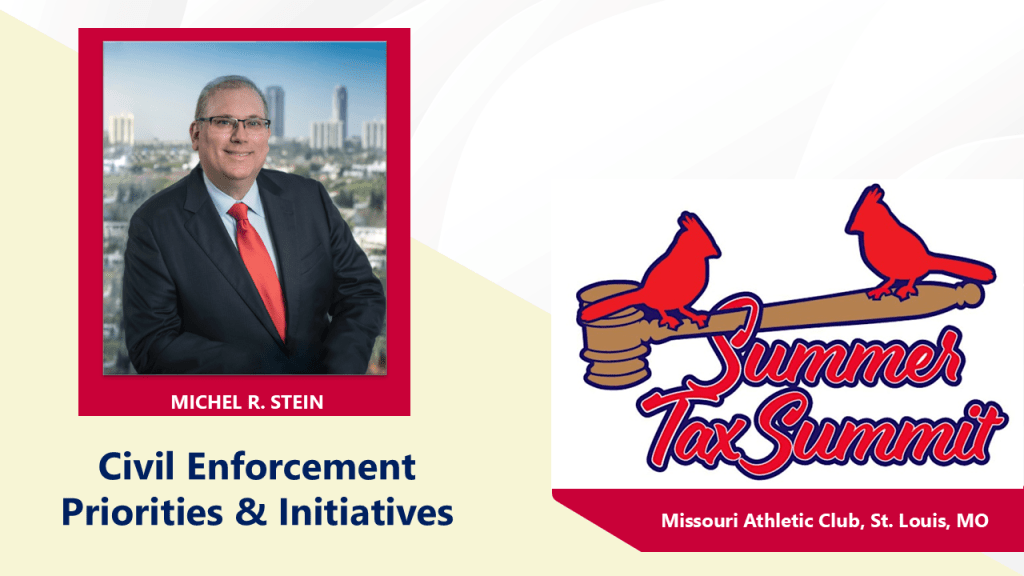 We are pleased to announce that Michel R. Stein, will be speaking at the upcoming Summer Tax Summit IRS Civil Enforcement Priorities & Initiatives seminar on Tuesday, August 26, 2025, 1:30 p.m. – 2:20 p.m. (CDT) at the Missouri Athletic Club, St. Louis Missouri.