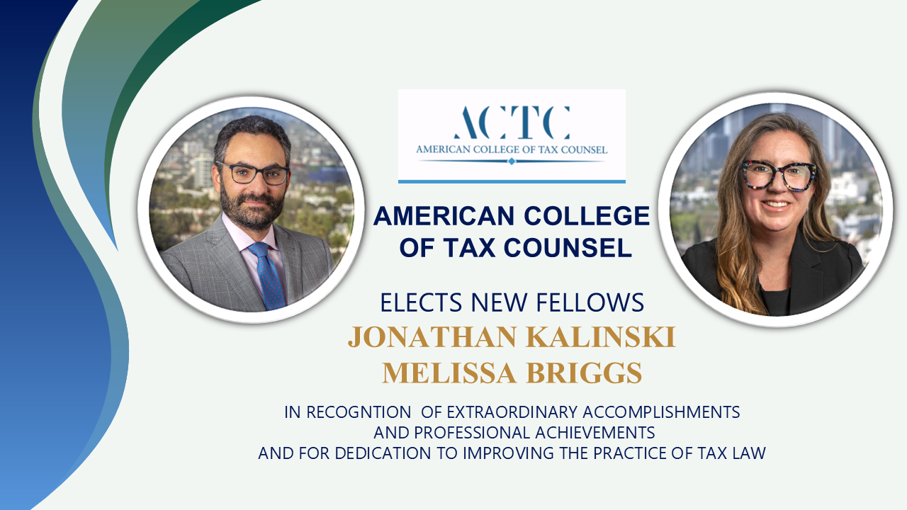 We are pleased to announce that Jonathan Kalinski and Melissa Briggs have been elected Fellowsof the American College of Tax Counsel. Jonathan and Melissa join eight other members of our firm who are Fellows of the most prestigious group of tax lawyers in the United States.