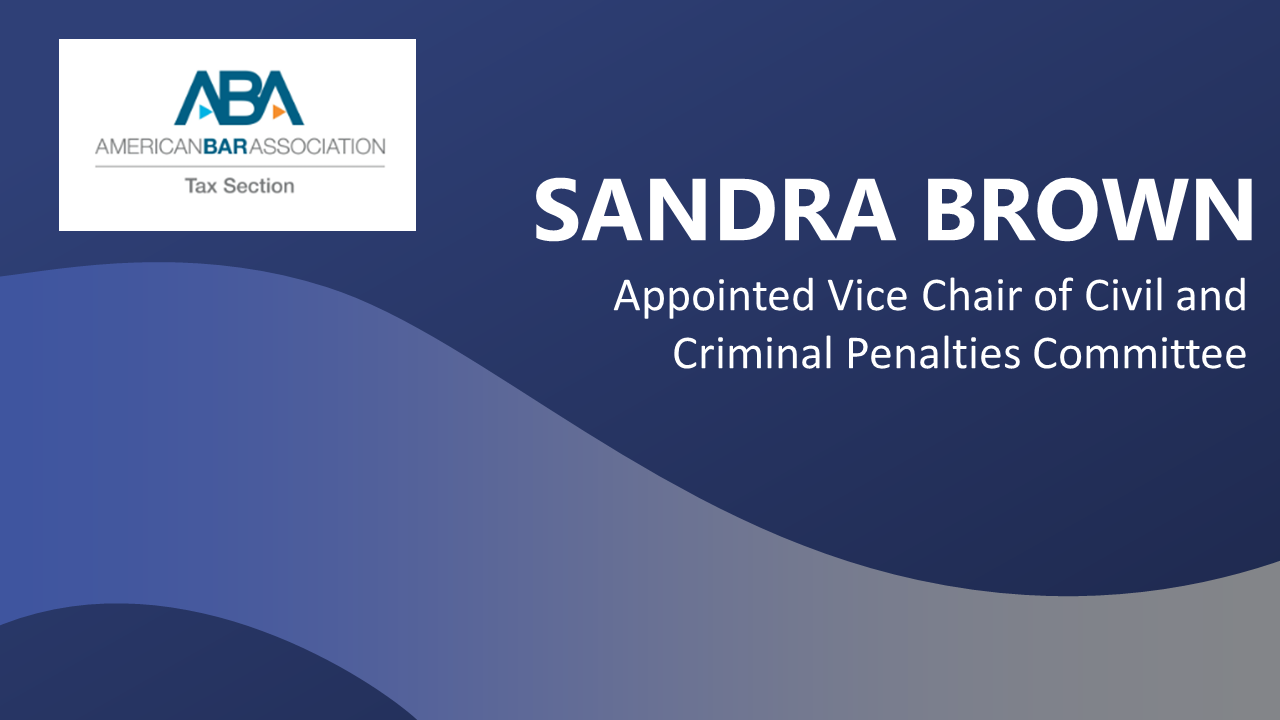 We are very pleased to announce that Sandra R. Brown has been appointed vice chair of the Section’s Civil and Criminal Tax Penalties Committee for the 2023-2024 term. Sandra’s selection as a committee vice chair and as a Section leader represents recognition by her peers of her abilities and contributions to the work of the Section.