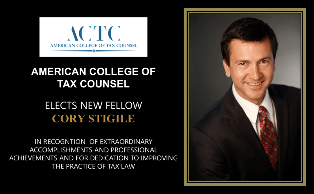 We are pleased to announce that Cory Stigile had been elected as Fellow of the American College of Tax Counsel. Cory joins seven other members of our firm who are Fellows of the most prestigious group of tax lawyers in the United States.